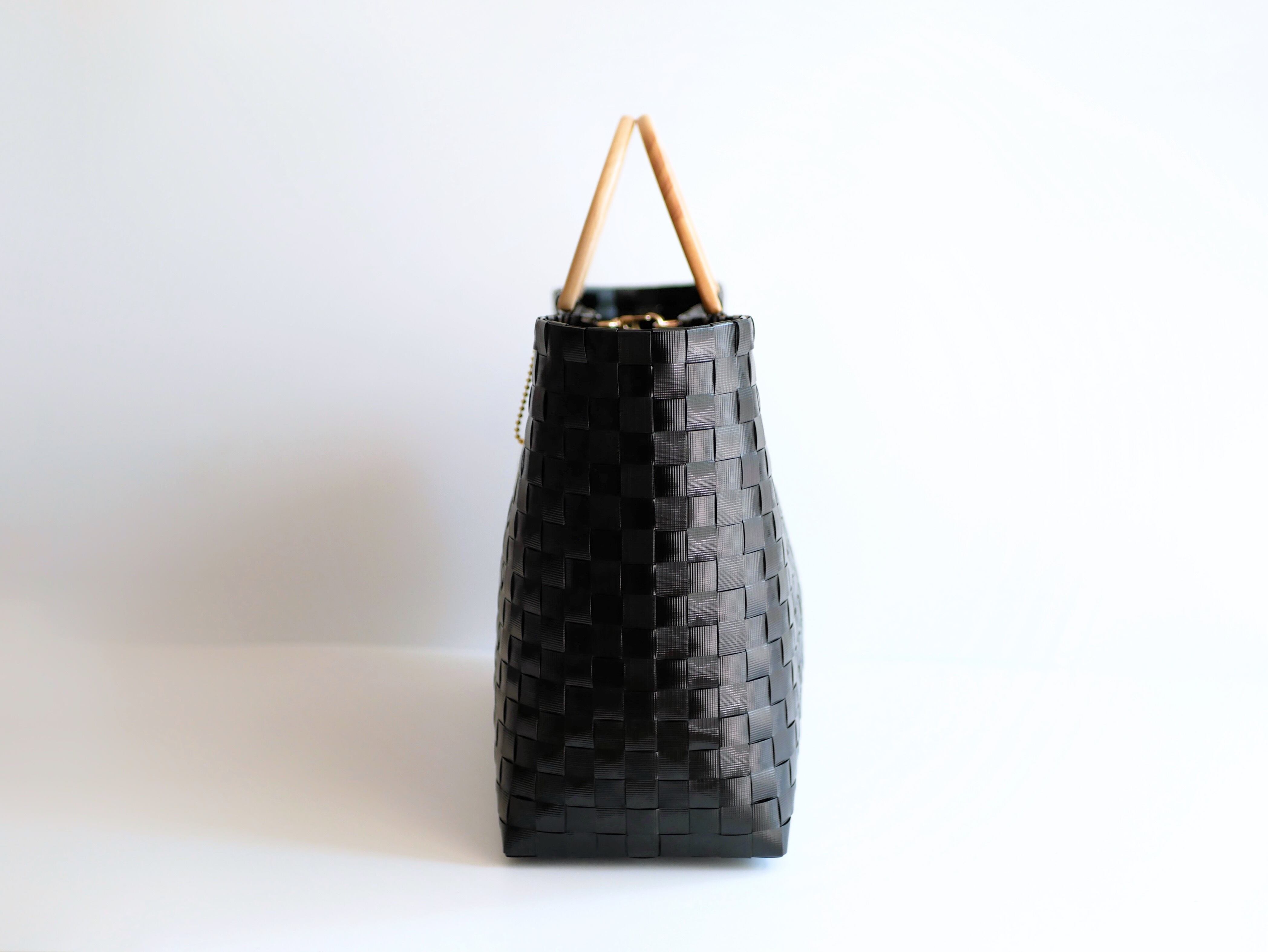 天然木ハンドルのプラかごバッグ LLサイズ ブラック B4サイズ 2WAY アウトドア マルシェバッグ【受注製作】