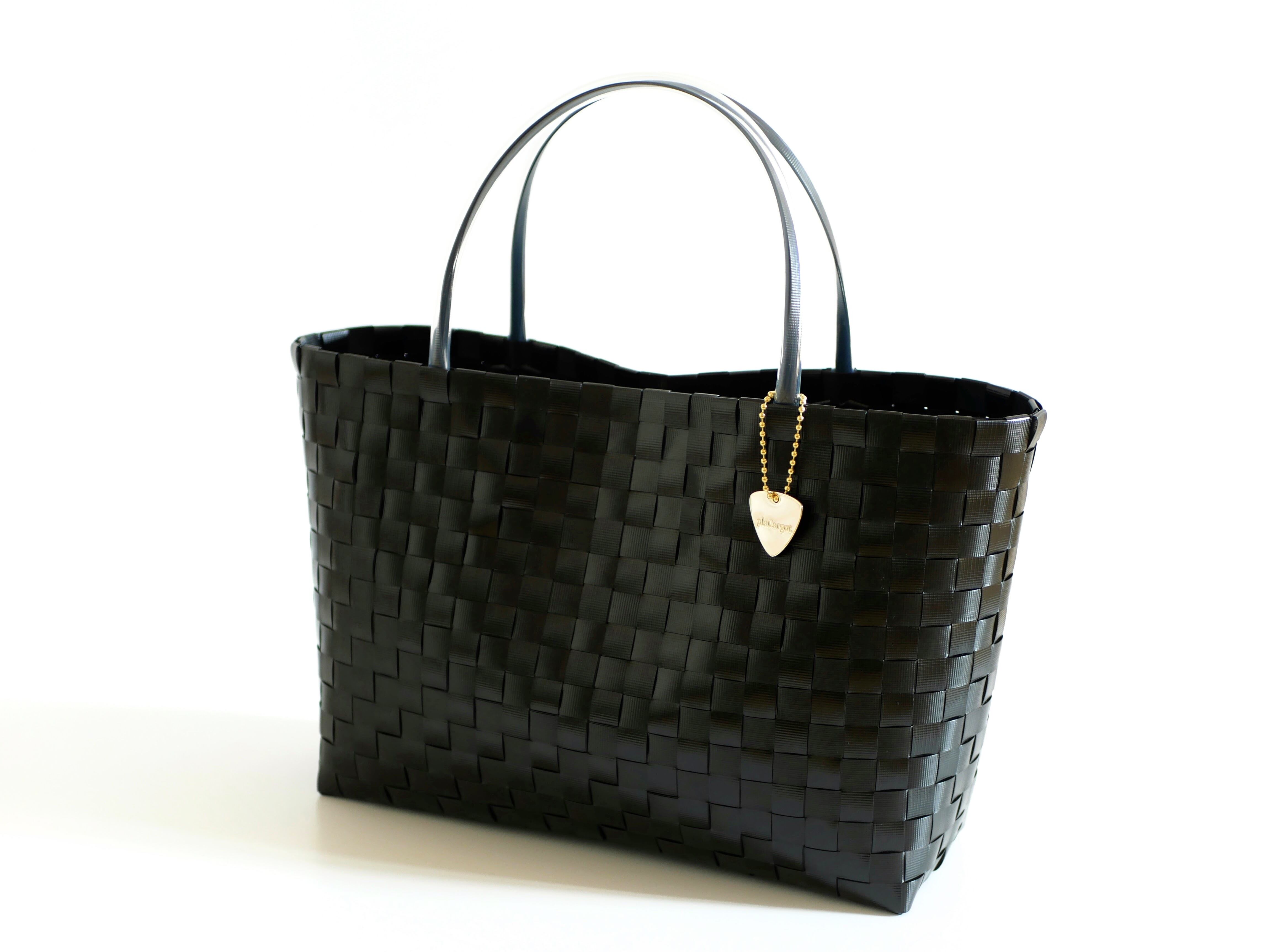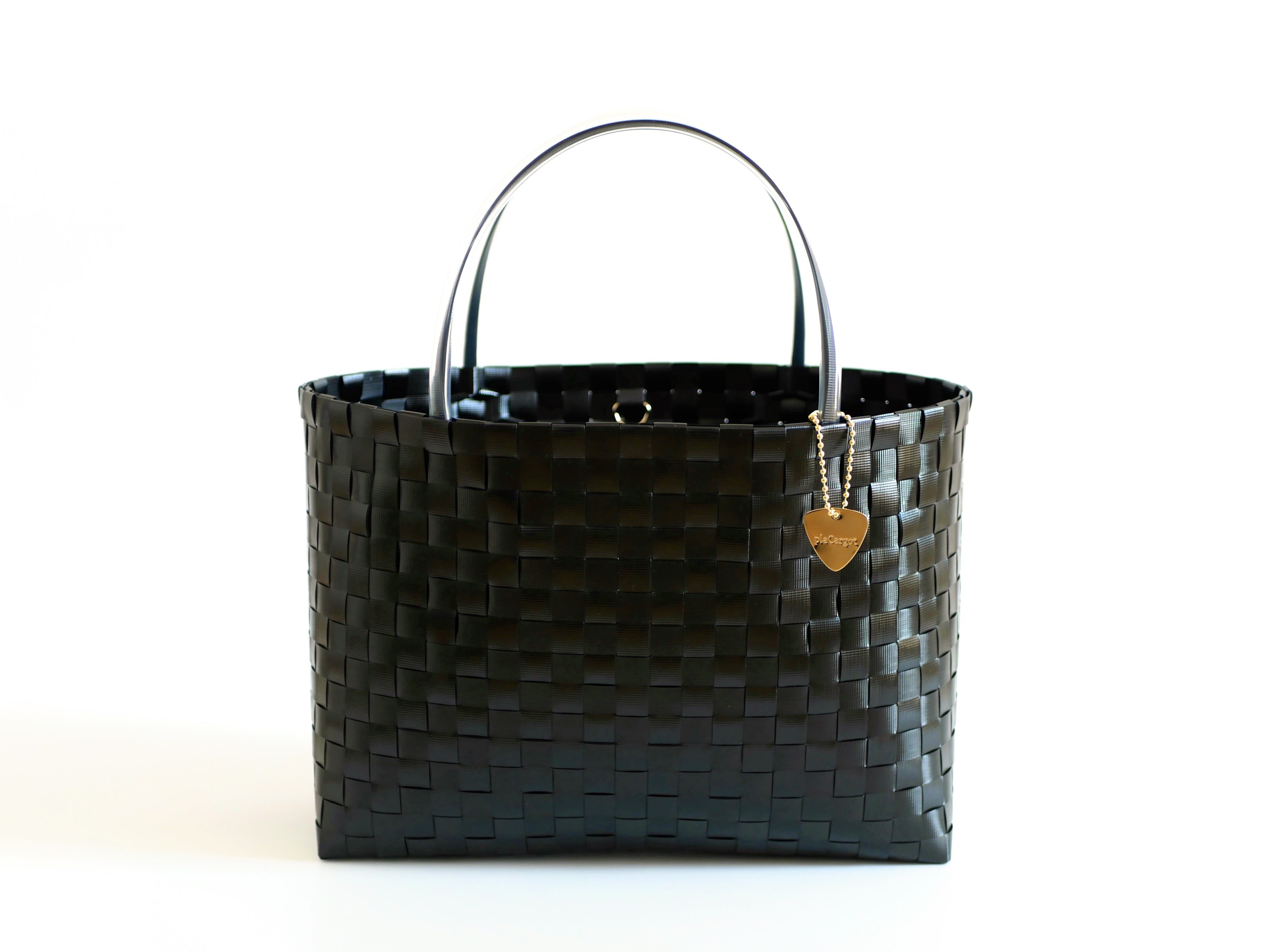 ポリプロピレンのバンドで編んだかごバッグ。水洗いOK。