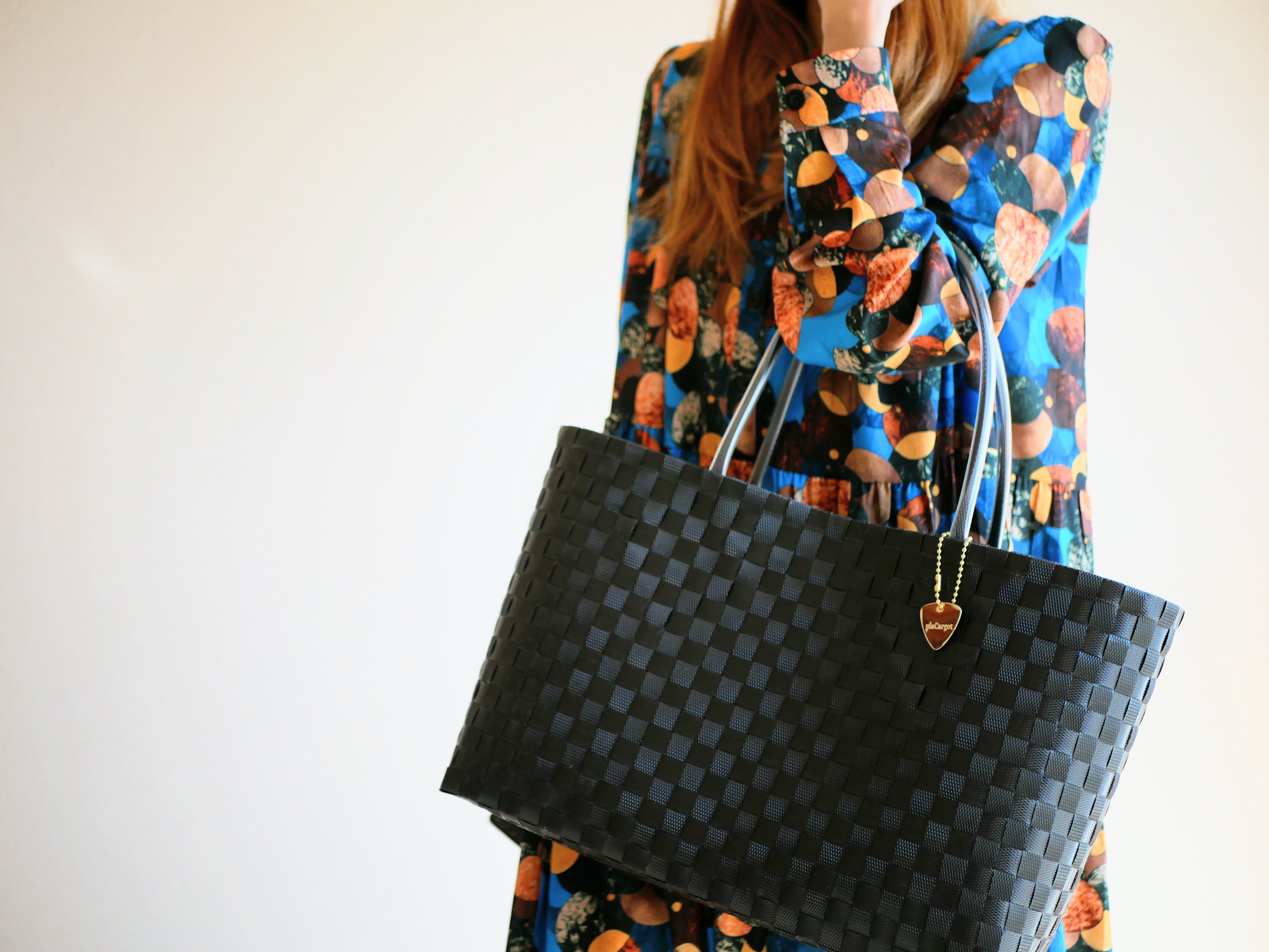 ポリプロピレンのバンドで編んだかごバッグ。水洗いOK。