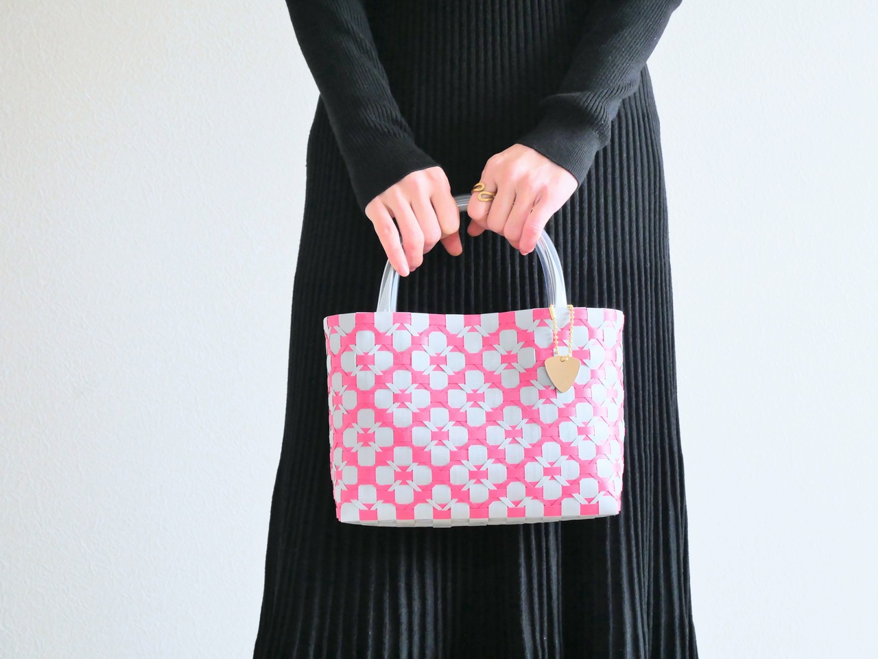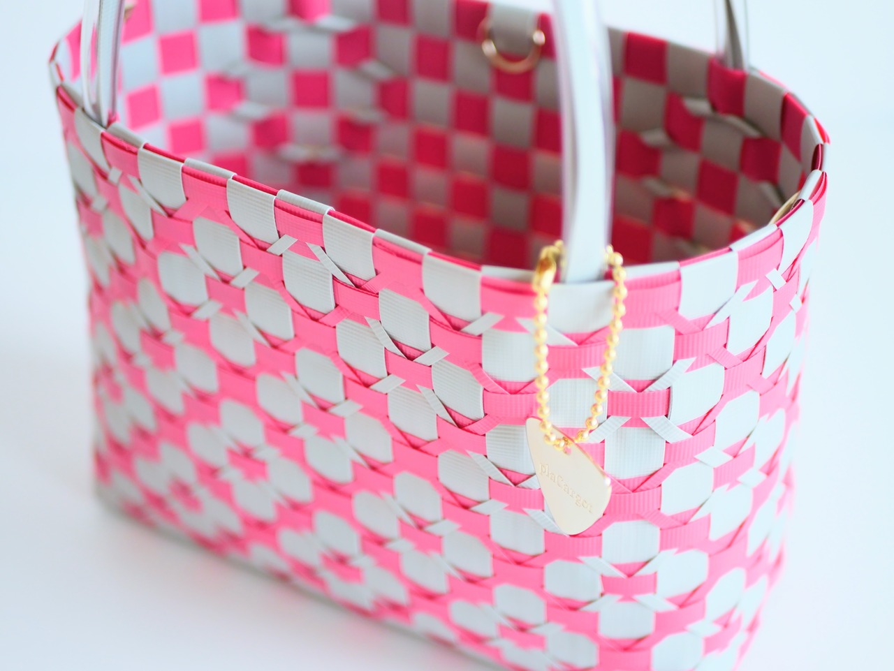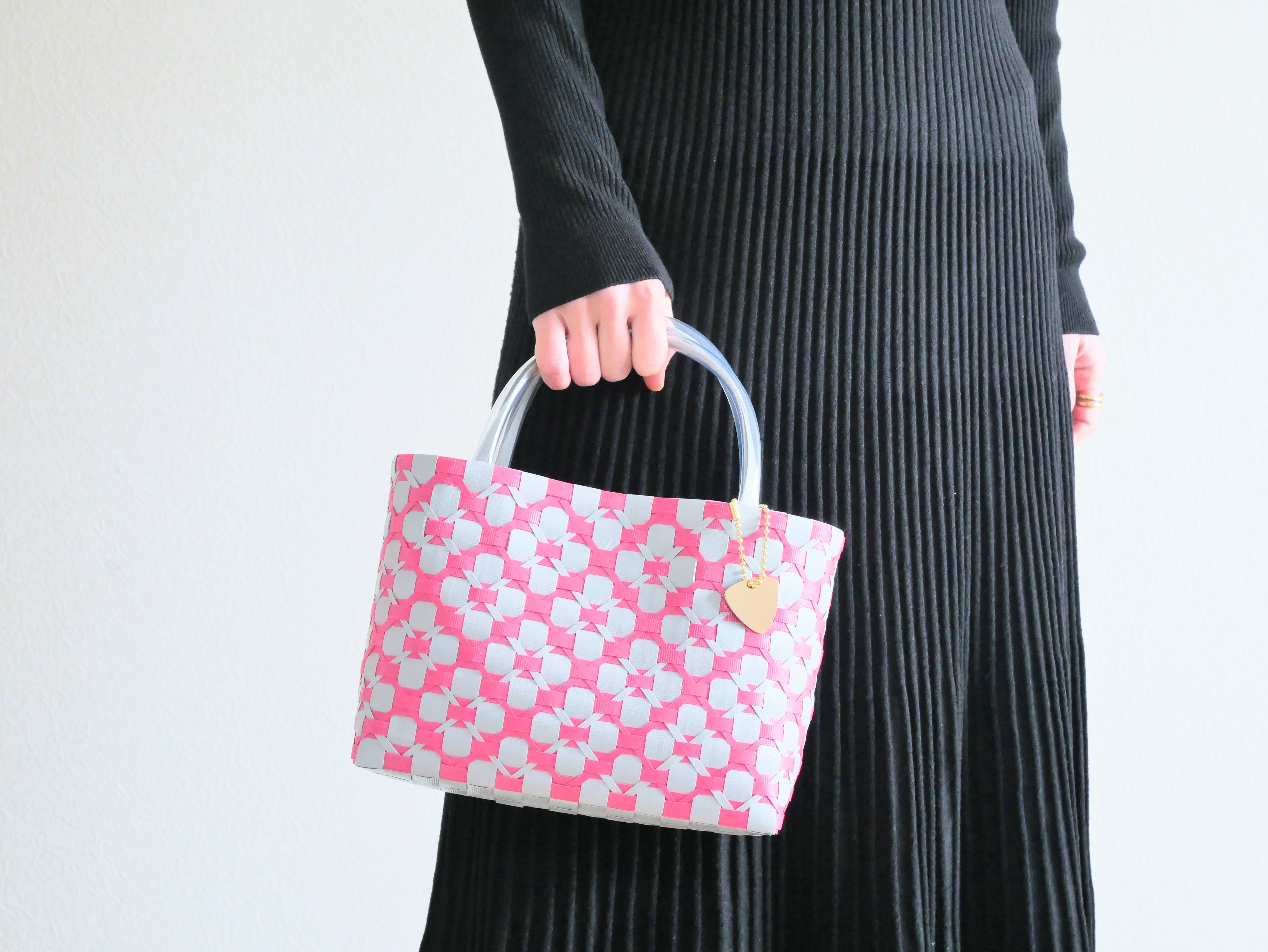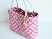 ポリプロピレンのバンドで編んだかごバッグ。水洗いOK。