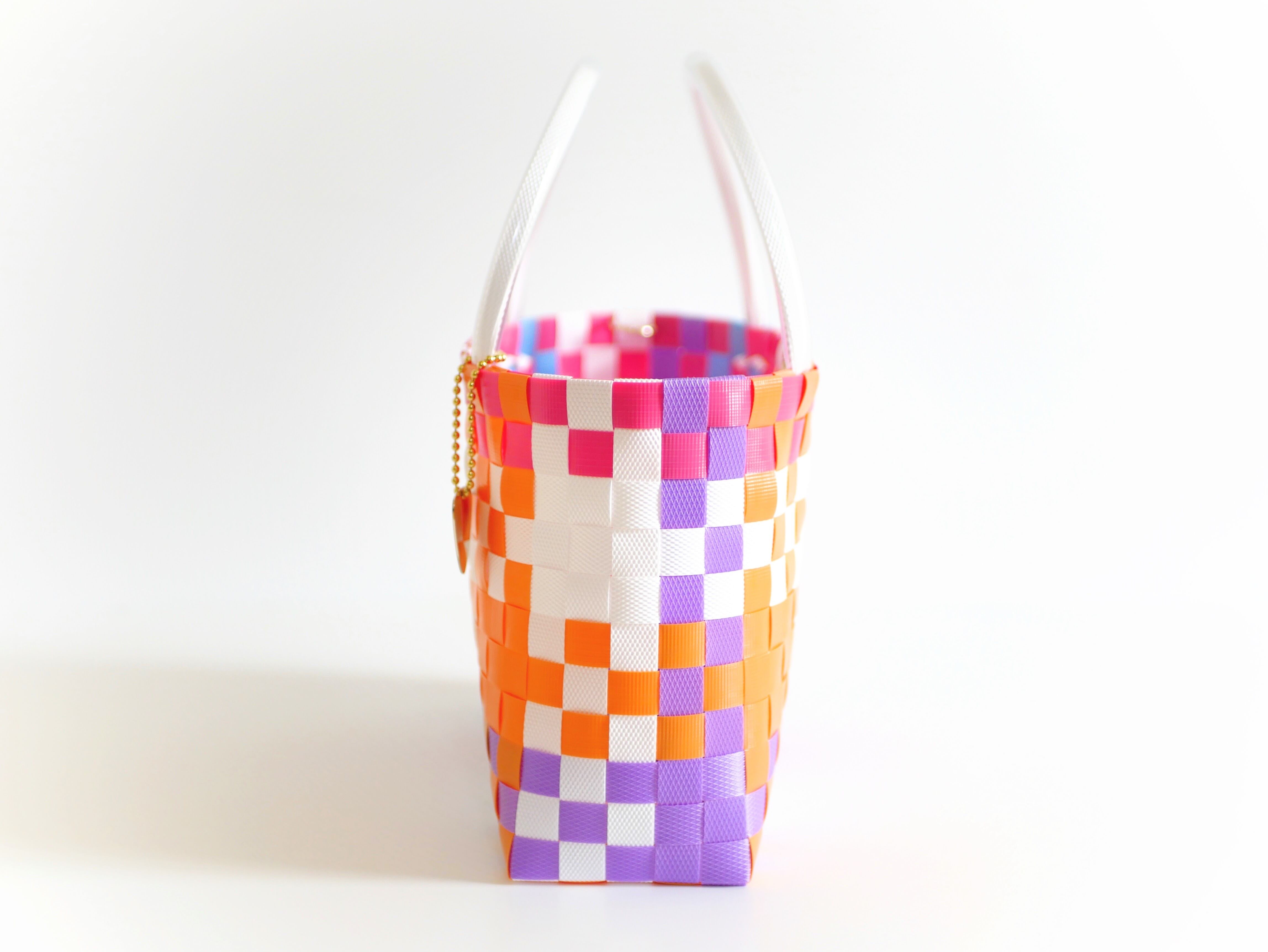 ポリプロピレンのバンドで編んだかごバッグ。水洗いOK。