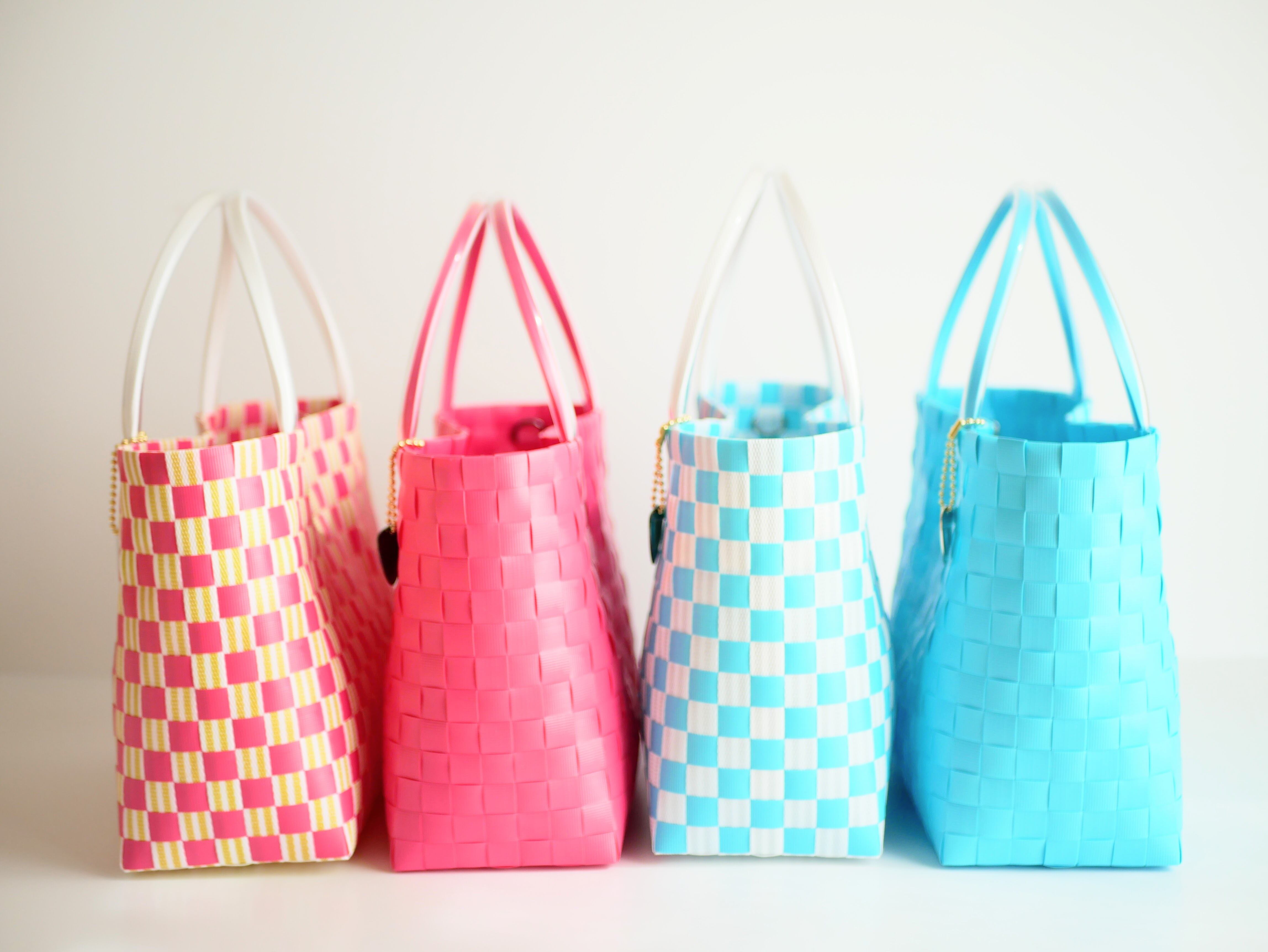 ポリプロピレンのバンドで編んだかごバッグ。水洗いOK。
