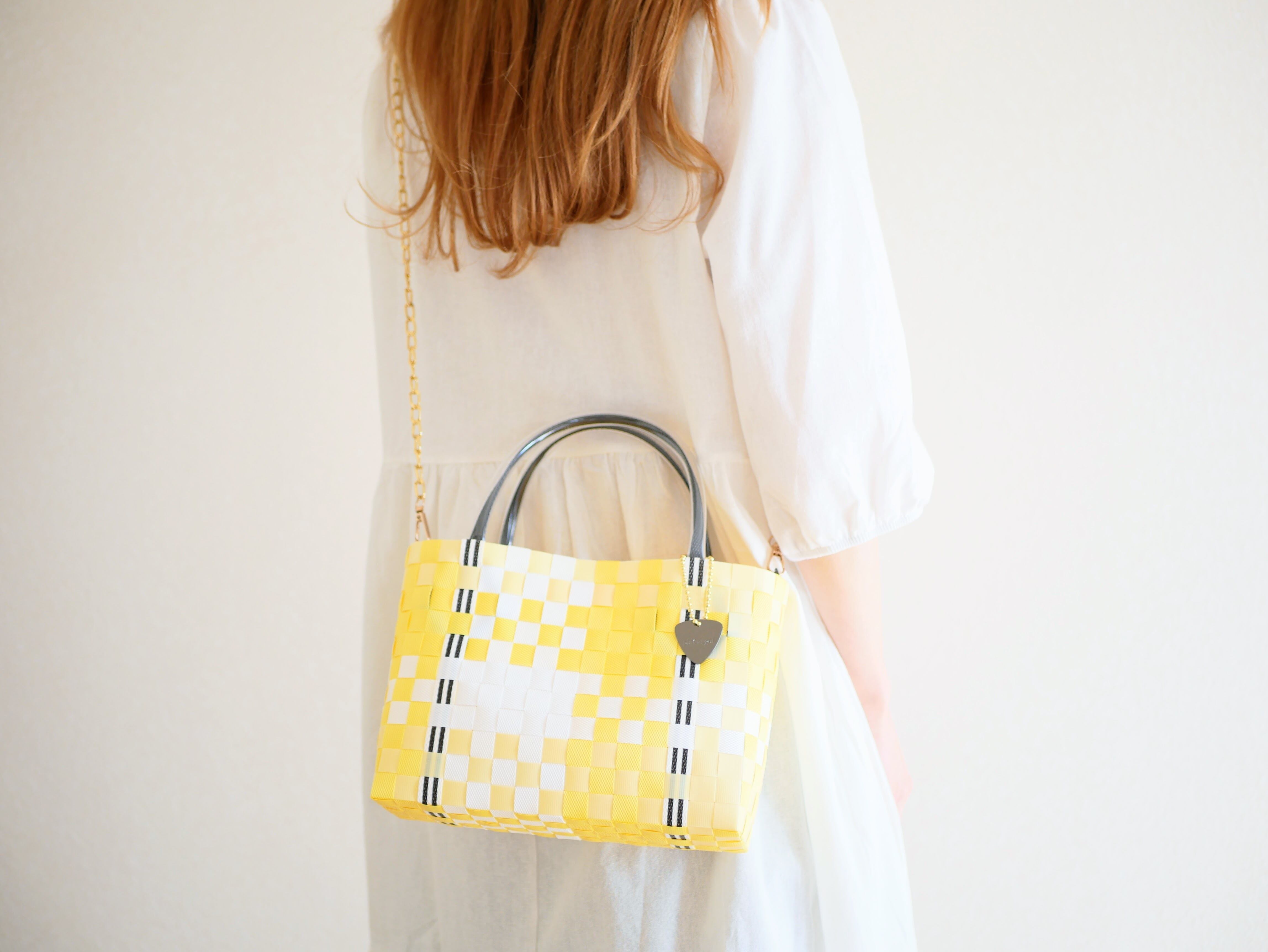 ポリプロピレンのバンドで編んだかごバッグ。水洗いOK。