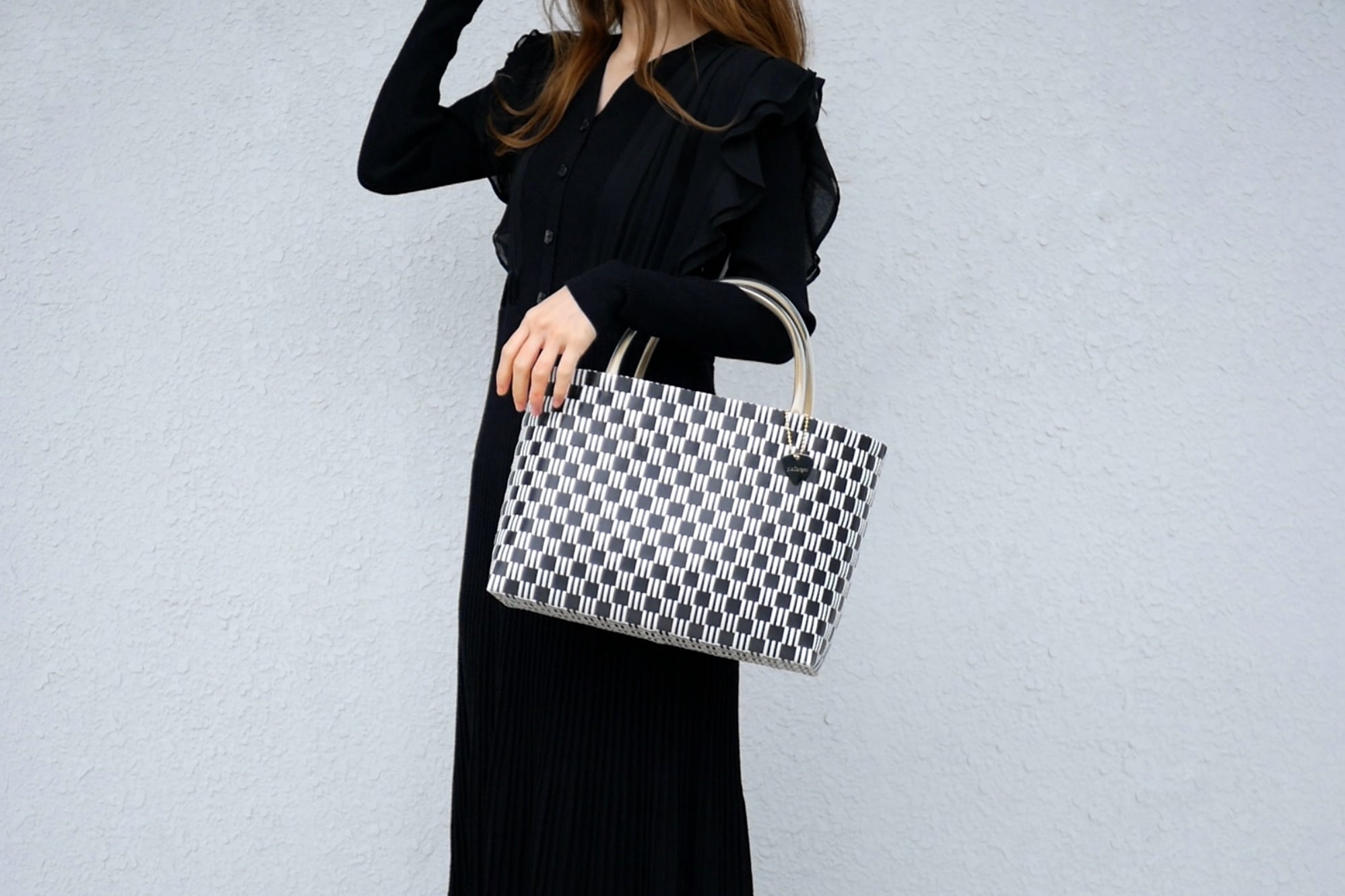 黒ストライプ×ベージュハンドルL 2WAYプラカゴバッグ/洗える/トートバッグ/ミニバッグ/スパバッグ/ジムバッグ/ハンドバッグ