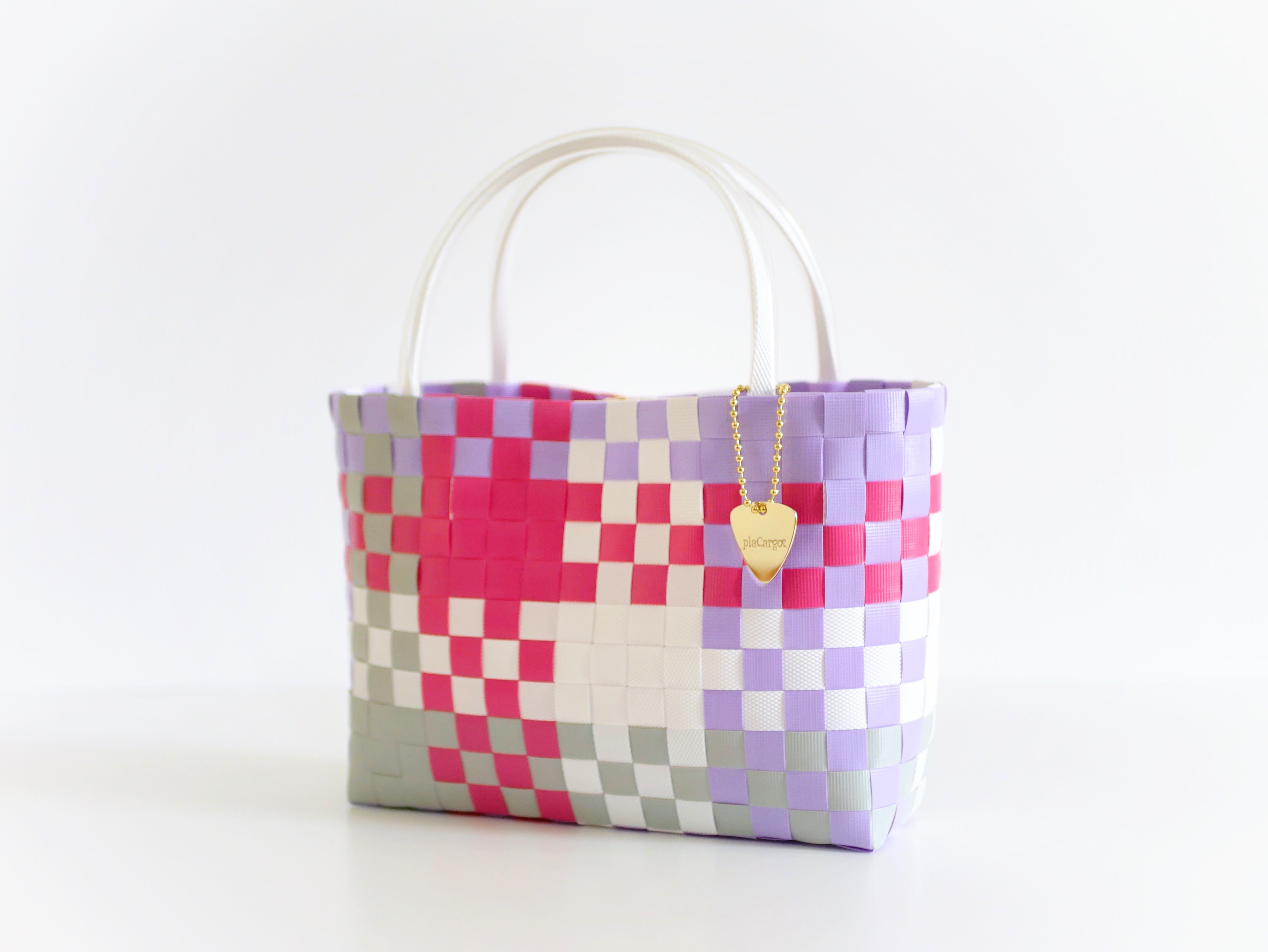 ポリプロピレンのバンドで編んだかごバッグ。水洗いOK。