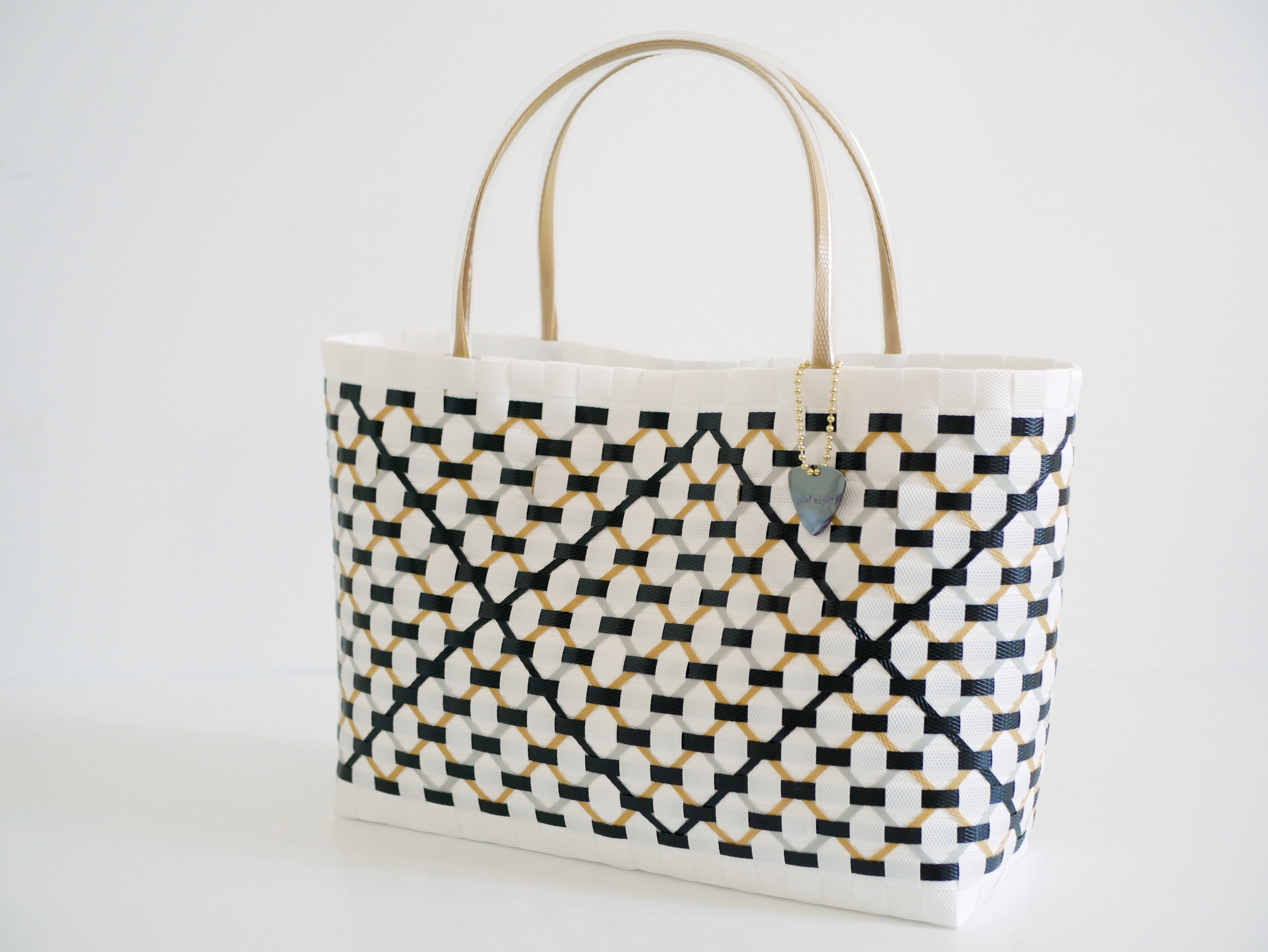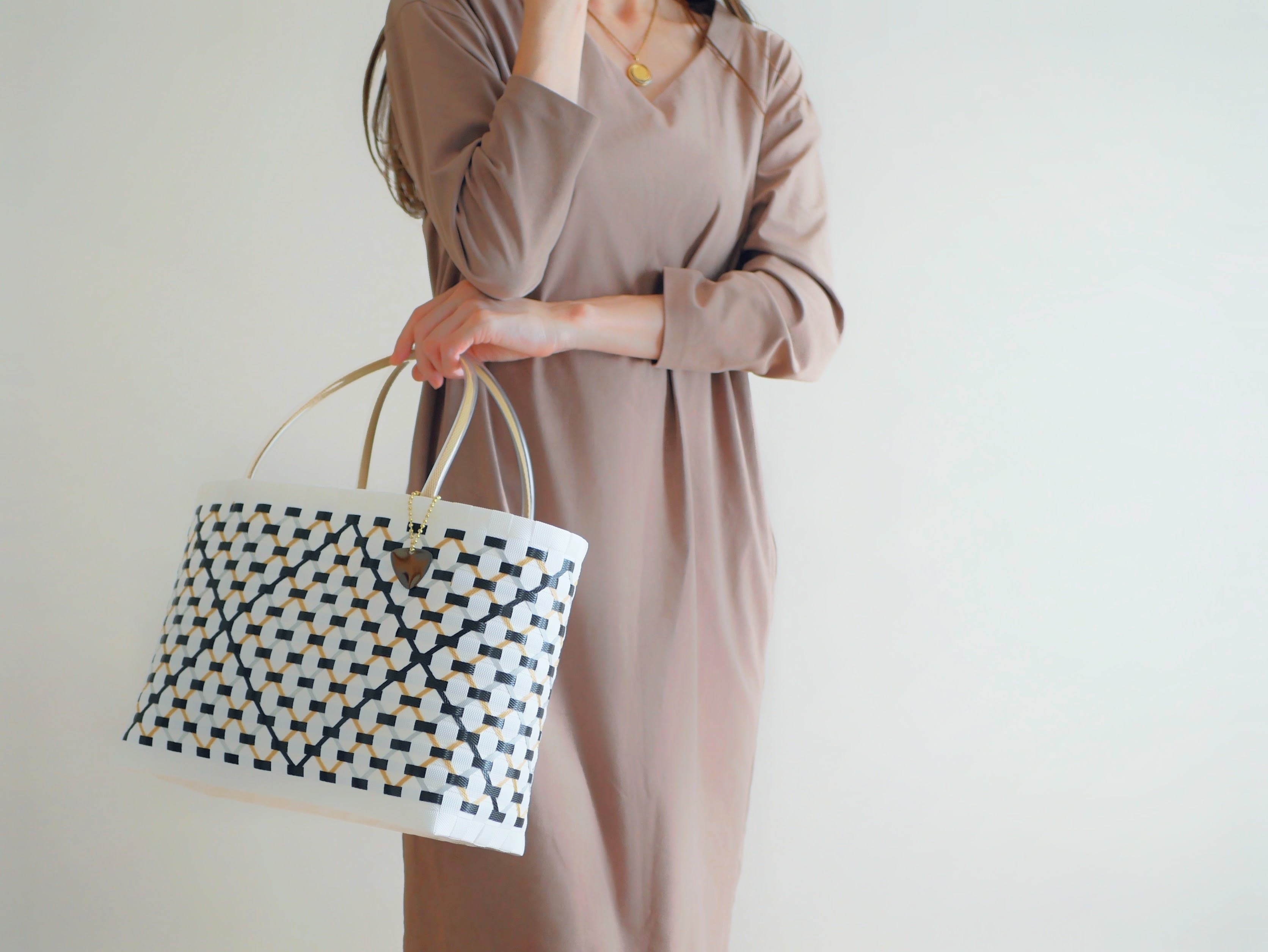 白をベースにした、爽やかで落ち着いたデザインです。持ち手のカラー、配色のバランス、上品さを求めてデザインしました。