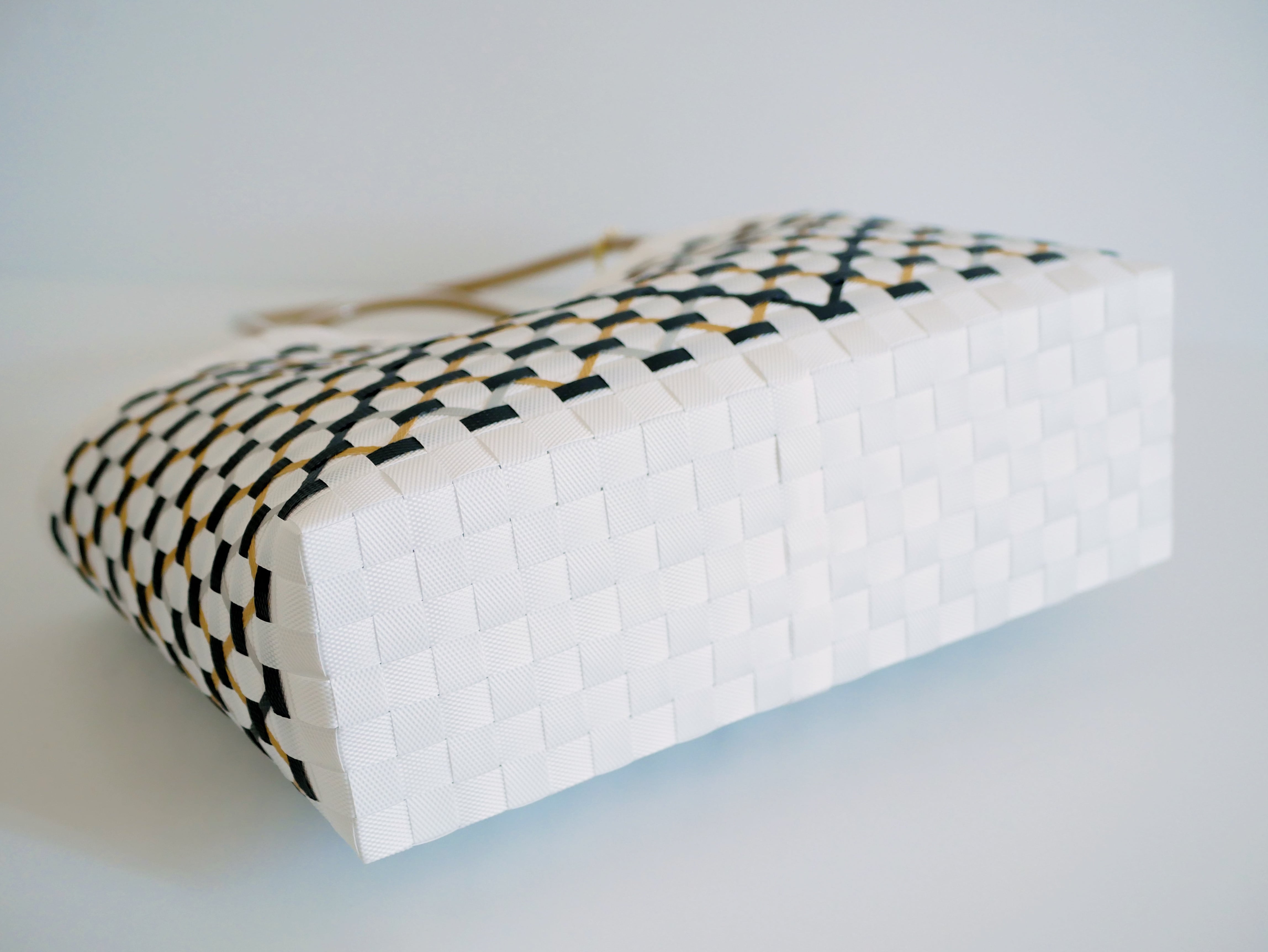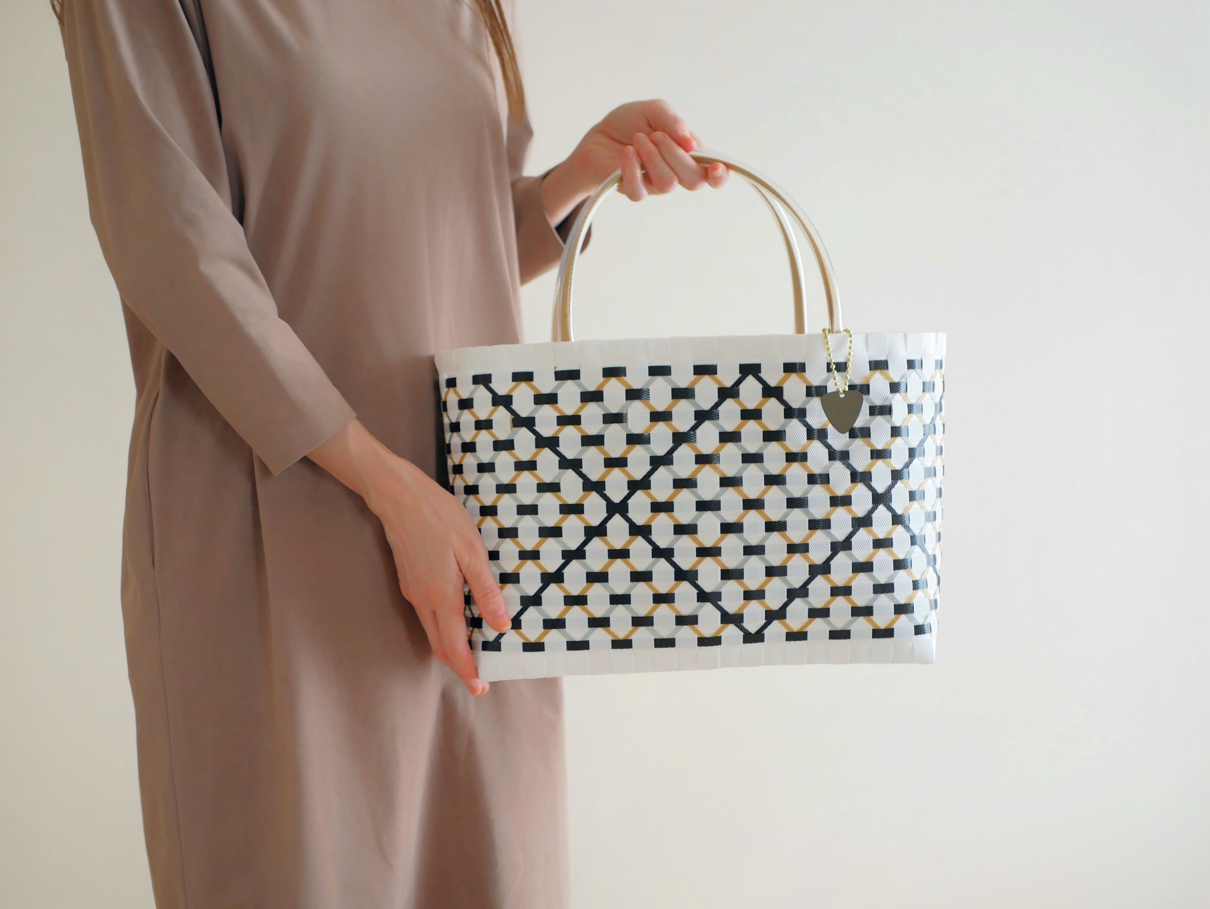 ポリプロピレンのバンドで編んだかごバッグ。水洗いOK。