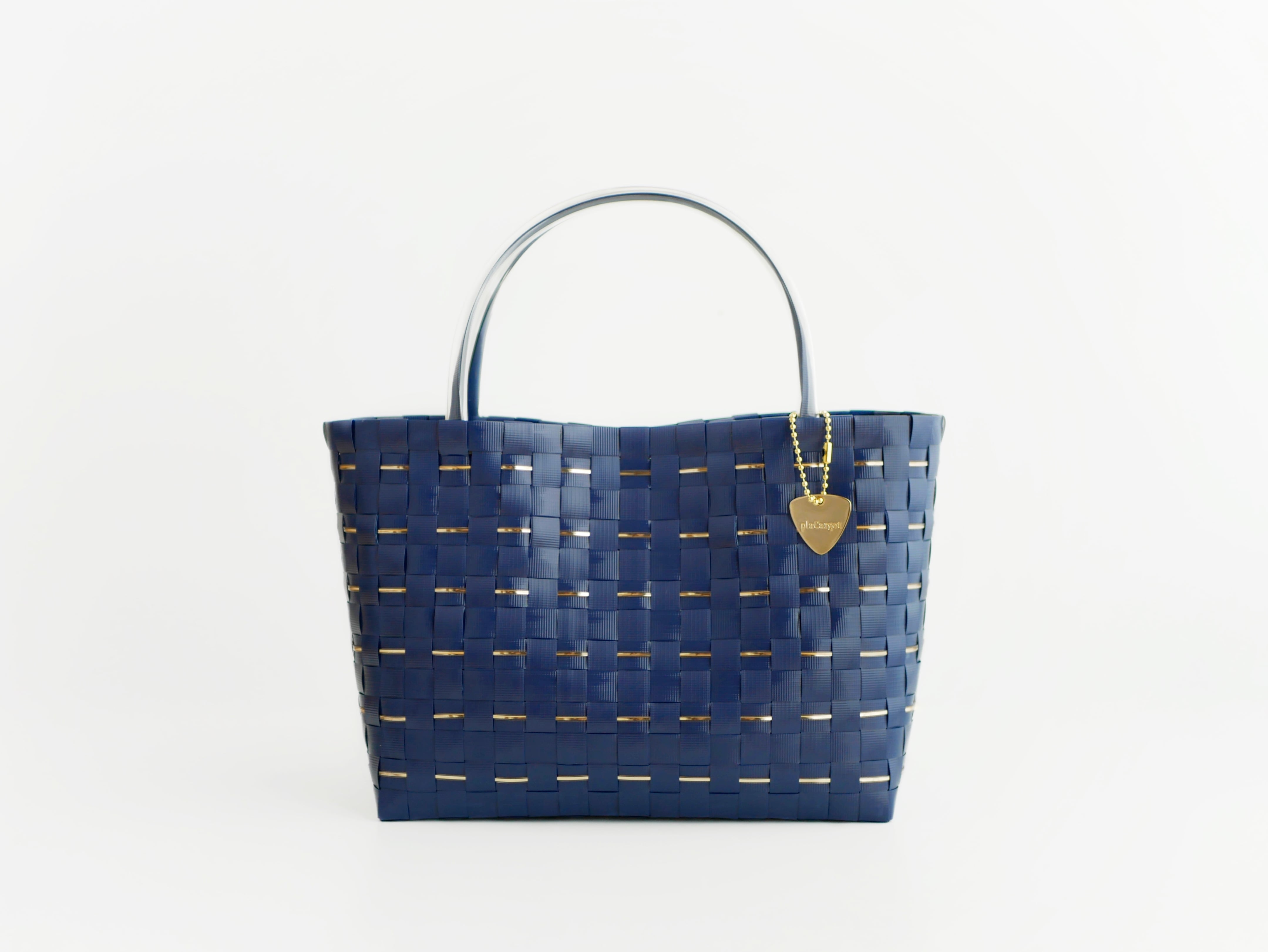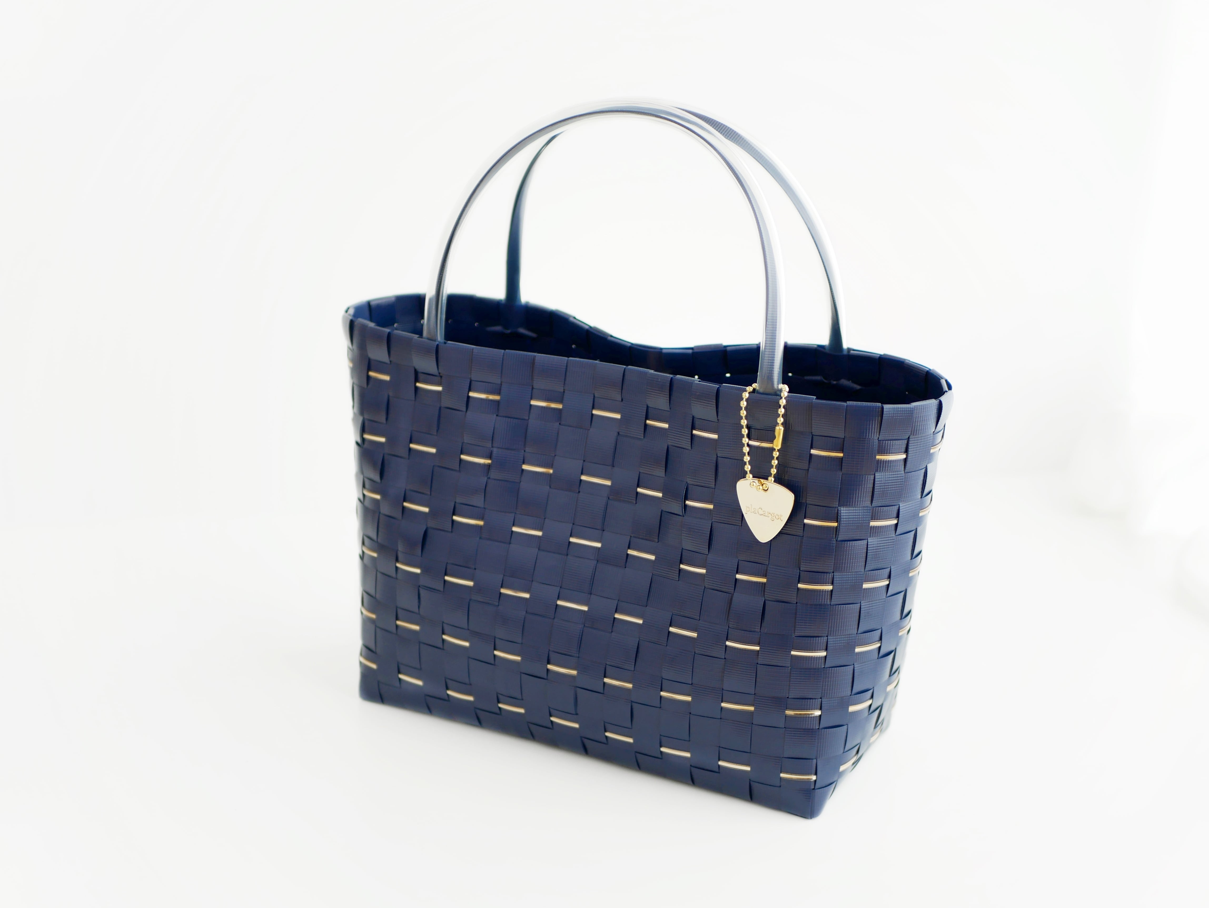きらめくゴールドラインをあしらった、上品なネイビーのプラカゴバッグ。