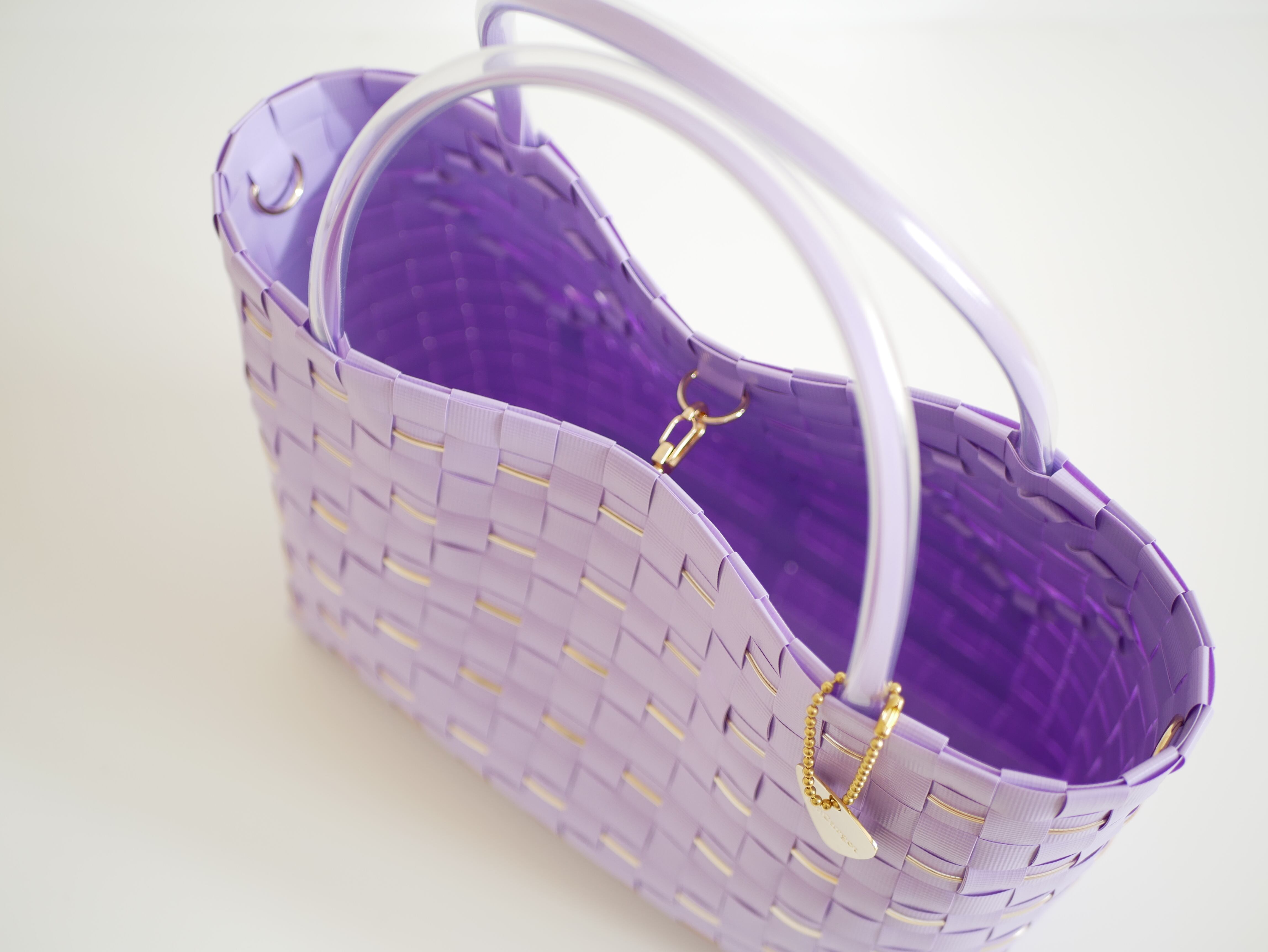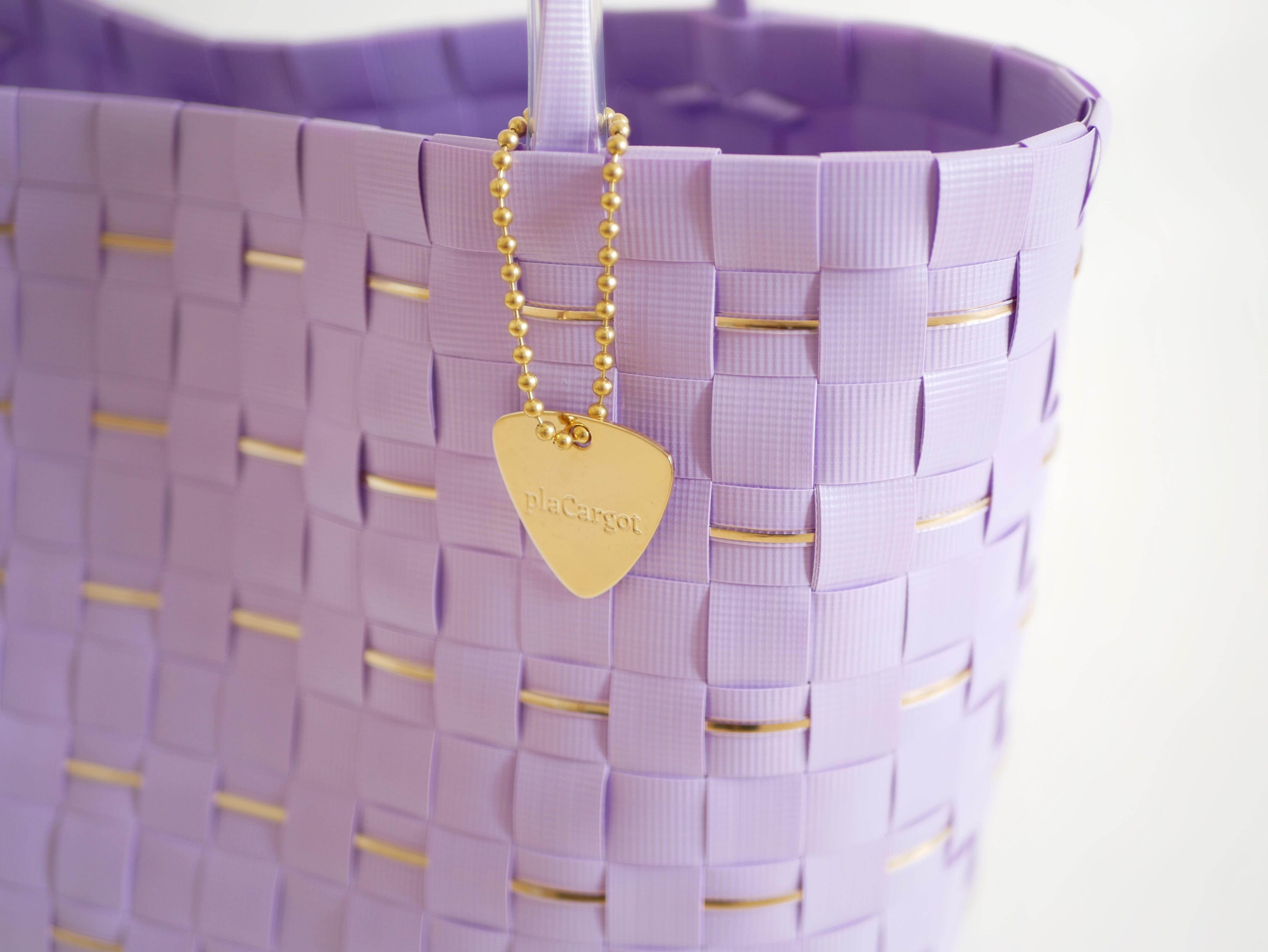 きらめくゴールドラインをあしらった、上品なラベンダーのプラカゴバッグ。