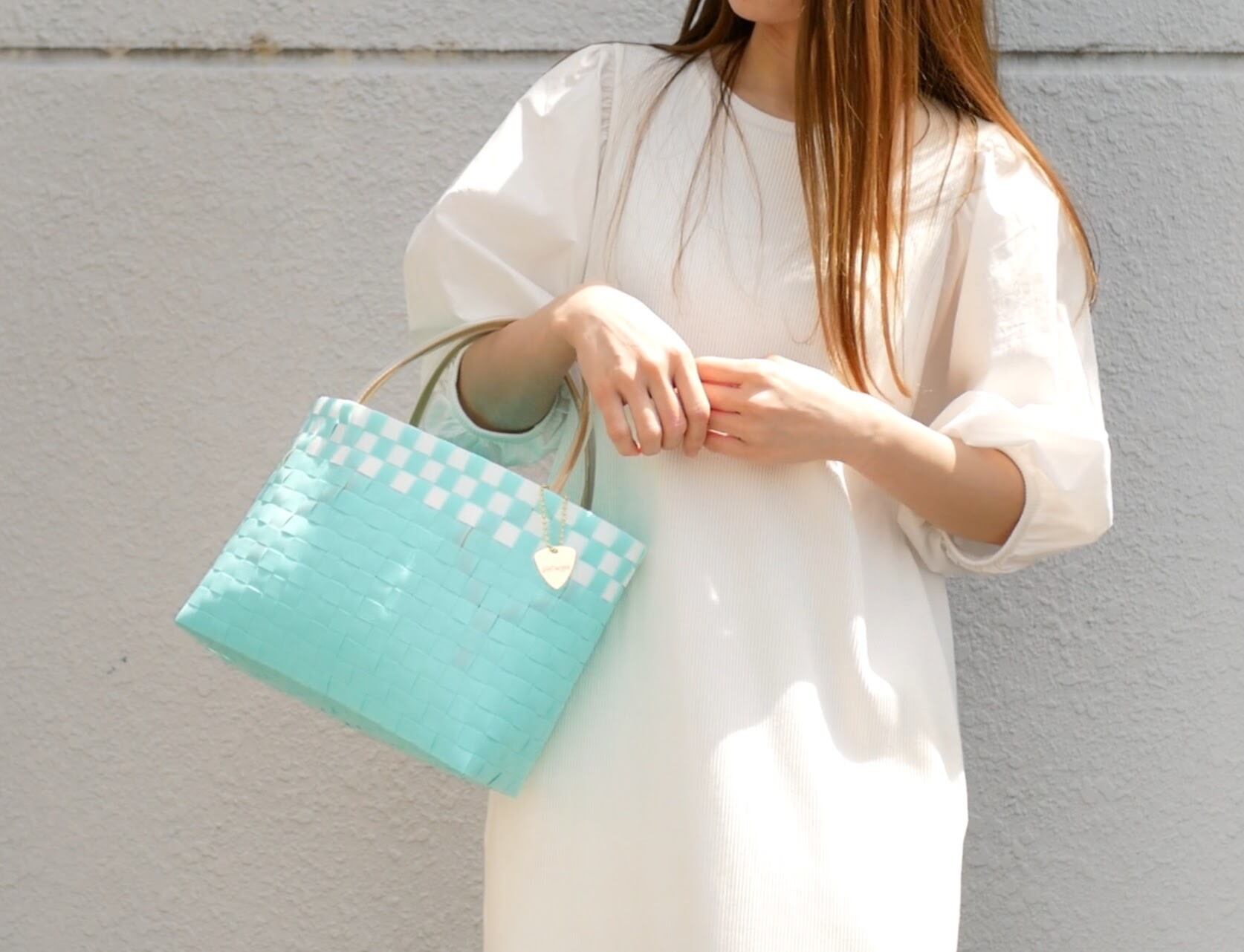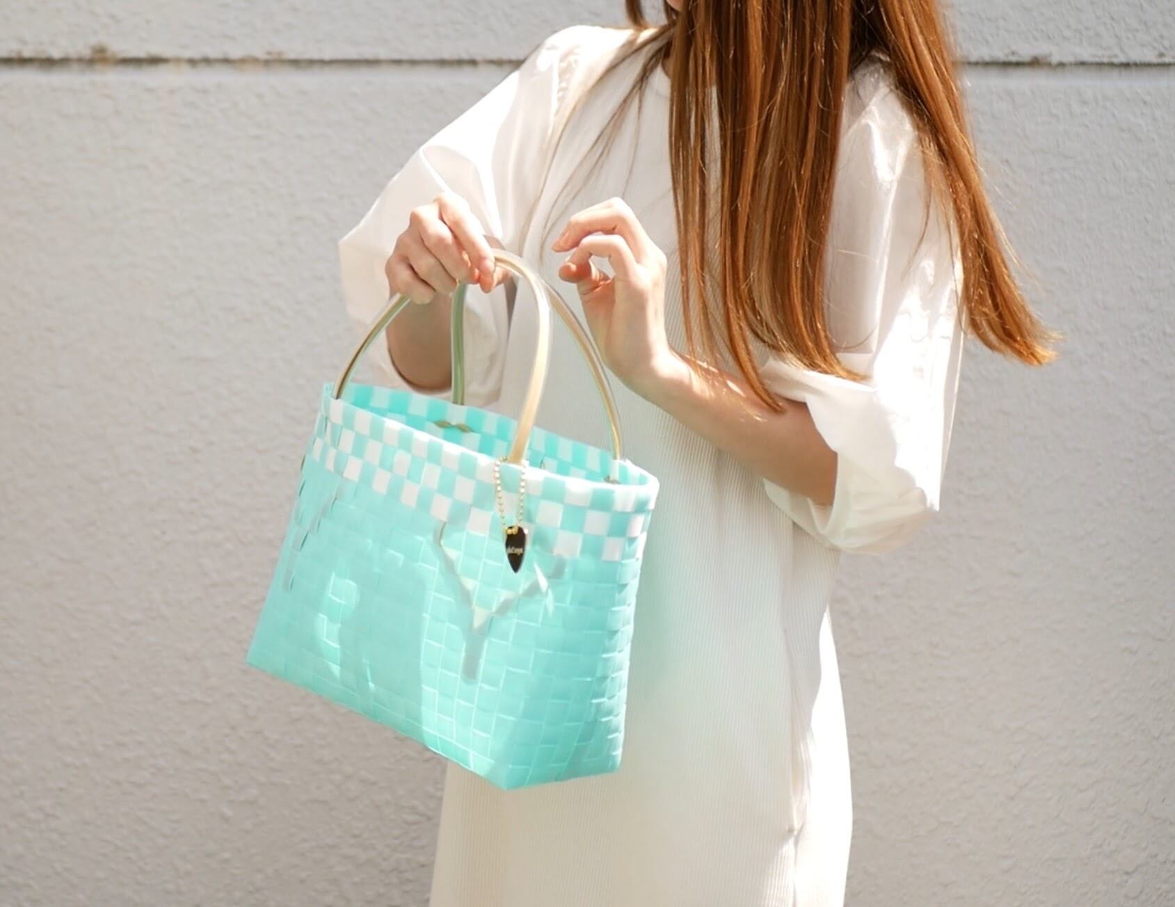 ポリプロピレンのバンドで編んだかごバッグ。水洗いOK。