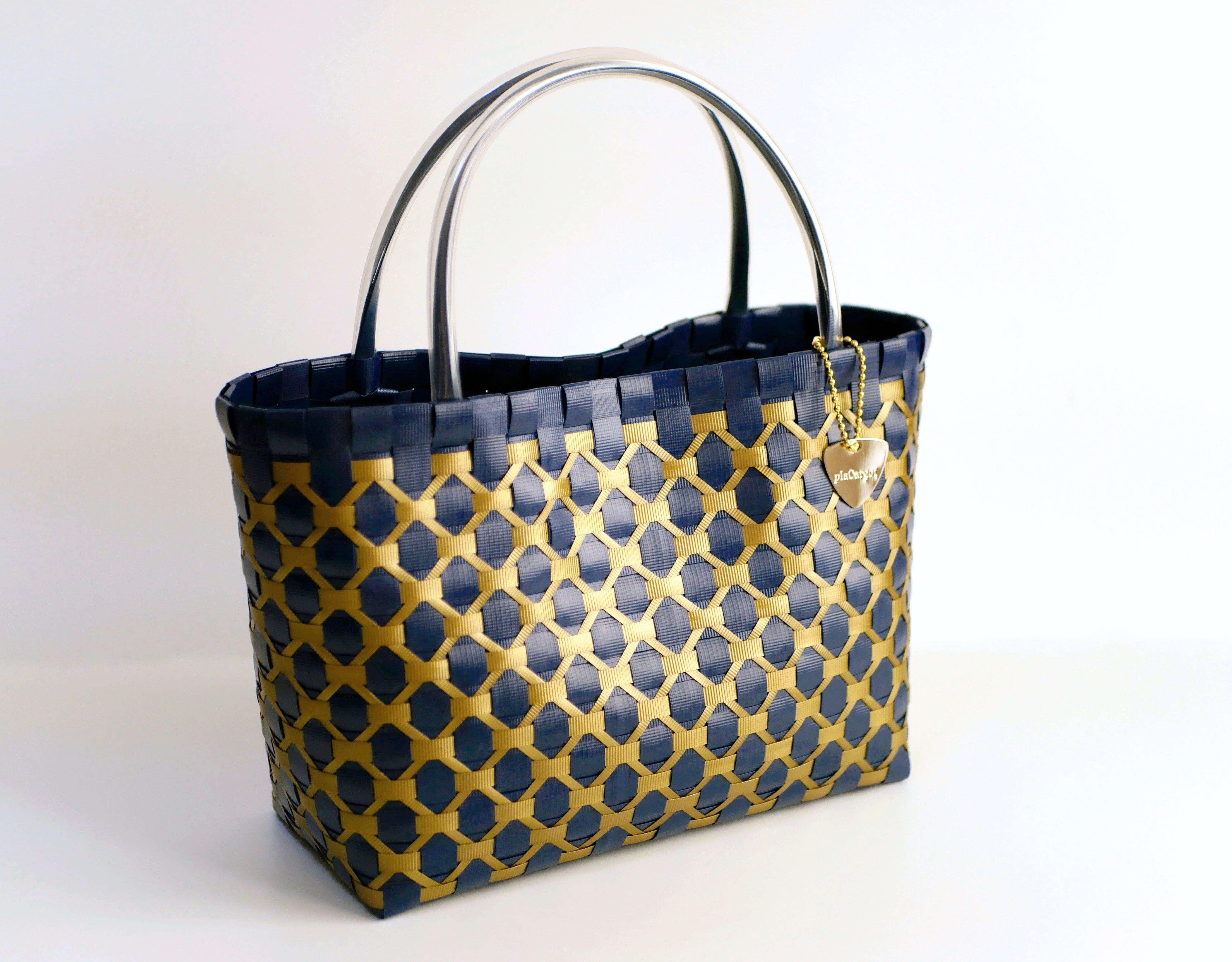 ネイビーに渋めのゴールドをあしらったプラカゴバッグです。