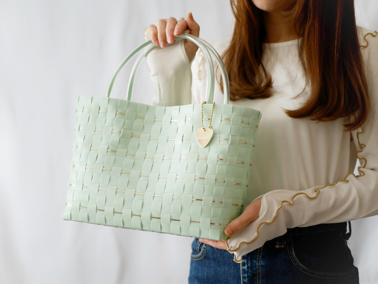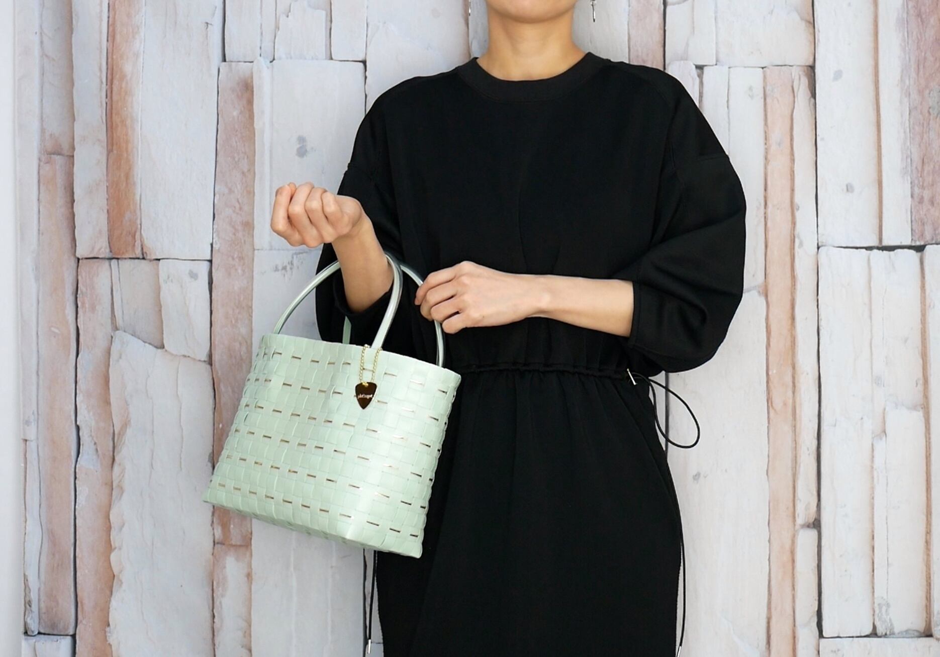 ポリプロピレンのバンドで編んだかごバッグ。水洗いOK。