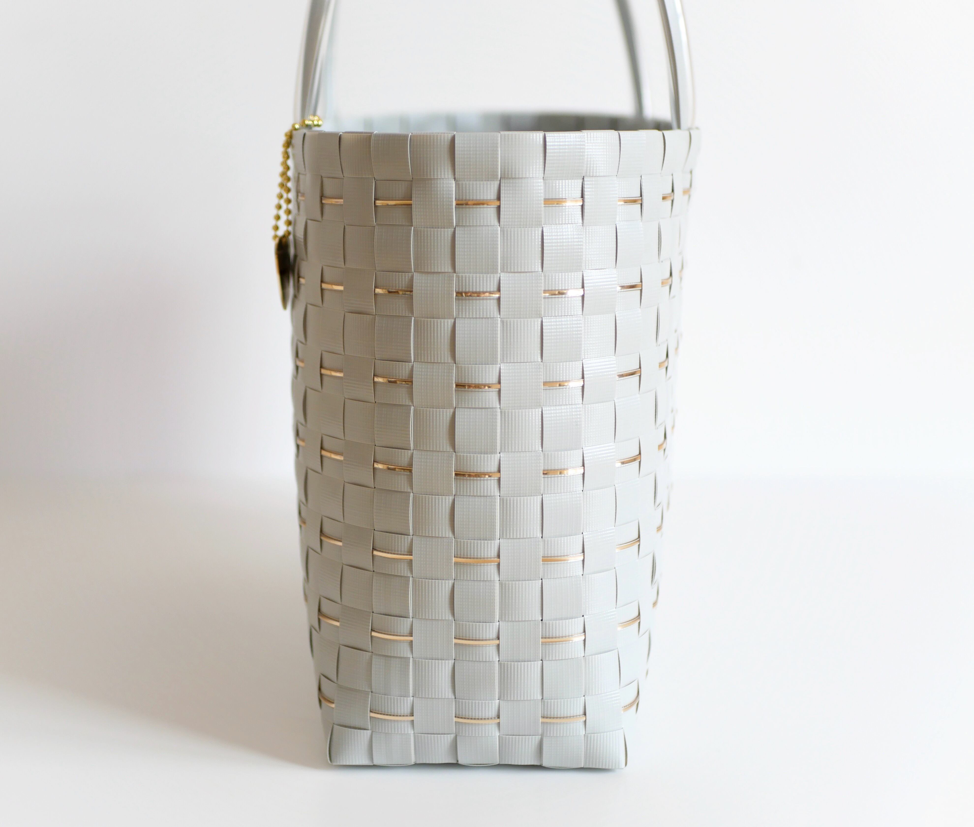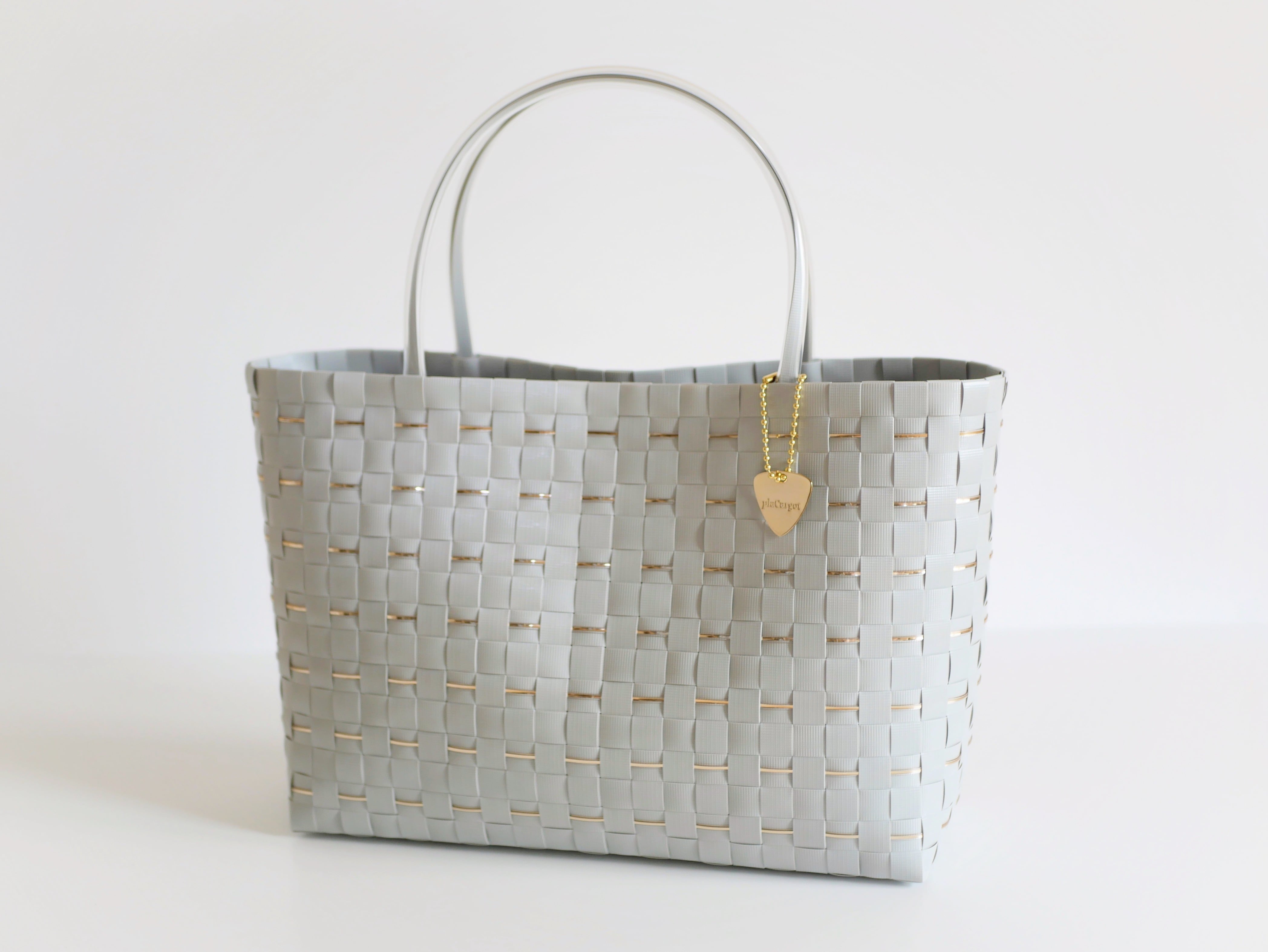 きらめくゴールドラインをあしらった、グレーのプラカゴバッグ。