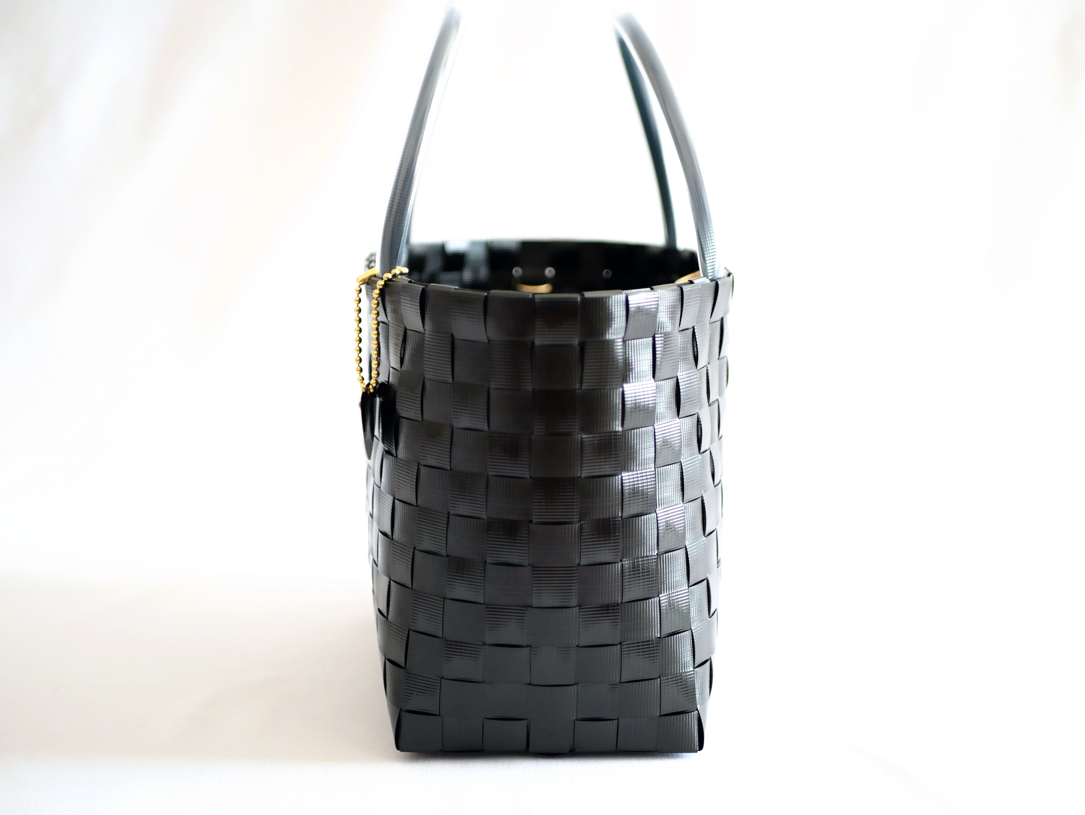 ポリプロピレンのバンドで編んだかごバッグ。水洗いOK。