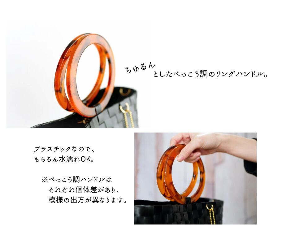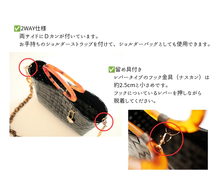 通常、チェーンストラップ(タイプA)2,700円のところ、べっこう調リングハンドルプラカゴバッグとの特別セット価格にて、プラス2,000円にて販売いたします。