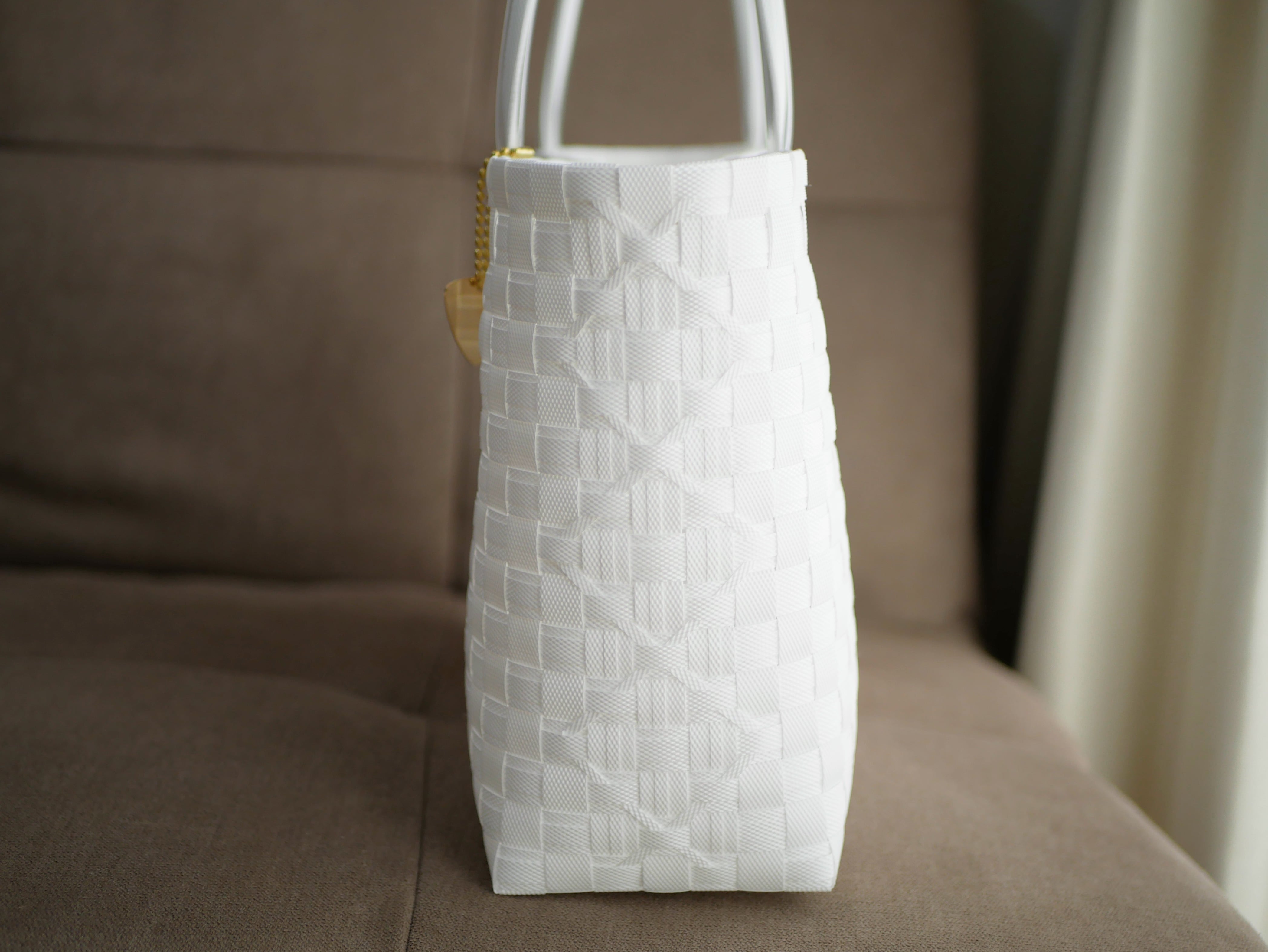 真っ白で爽やかなプラカゴバッグ。中央とサイドに、編み込み風の模様をつけました。オールホワイトで超シンプルですが、良く見ると可愛い模様が♡なデザインです。
